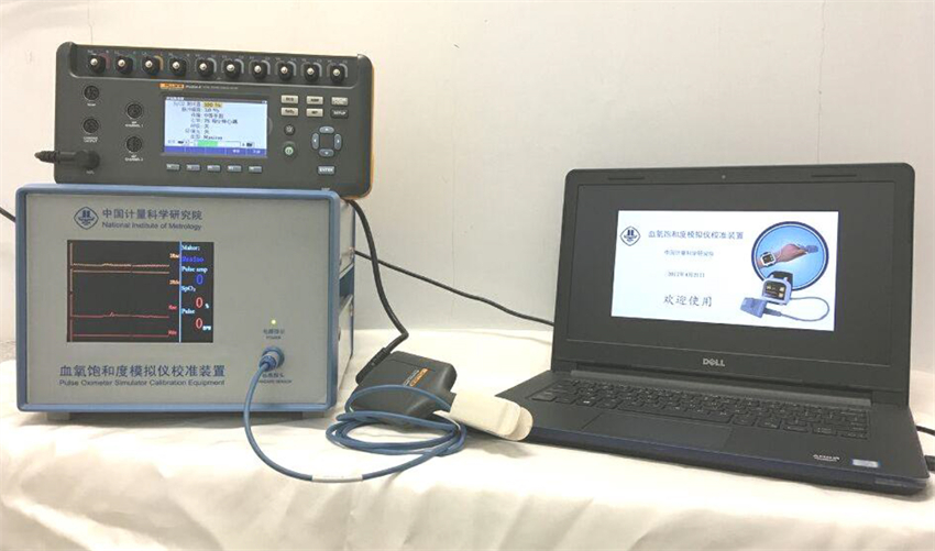 上圖左部下方為“血氧飽和度模擬儀校準裝置”,校準裝置上方為被測的 Prosime8 模擬儀,校準裝置右方為電腦和軟件。