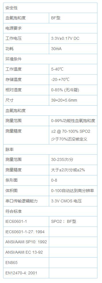主要特征 * 體積小,安裝方便;可靠性、精確性高 * 增強了信號處理能力,減少了人為運動和弱灌注帶來的影響 * 適用于成人、嬰幼兒和新生兒 * 工作電壓3.3 v,低電壓 * 能顯示血氧圖和脈搏柱 * 傳送協議兼容BCI * 可以使用兼容BCI探頭