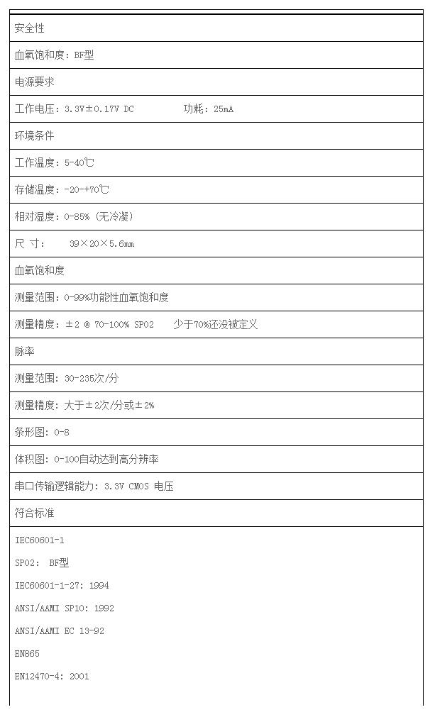 1:體積小,安裝方便;可靠性、精確性高 2:增強了信號處理能力,減少了人為運動和弱灌注帶來的影響 3:適用于成人、嬰幼兒和新生兒 4:工作電壓3.3 v,低電壓 5:能顯示血氧圖和脈搏柱 6:傳送協議兼容BCI 7:可以使用兼容BCI 探頭 8:通訊連接:與CSN604 模塊的串行傳輸采用TTL電平。如果用戶想要通過RS232端口來傳輸數據,數據信號需要用RS232 驅動器來轉換(如:MAX232)。